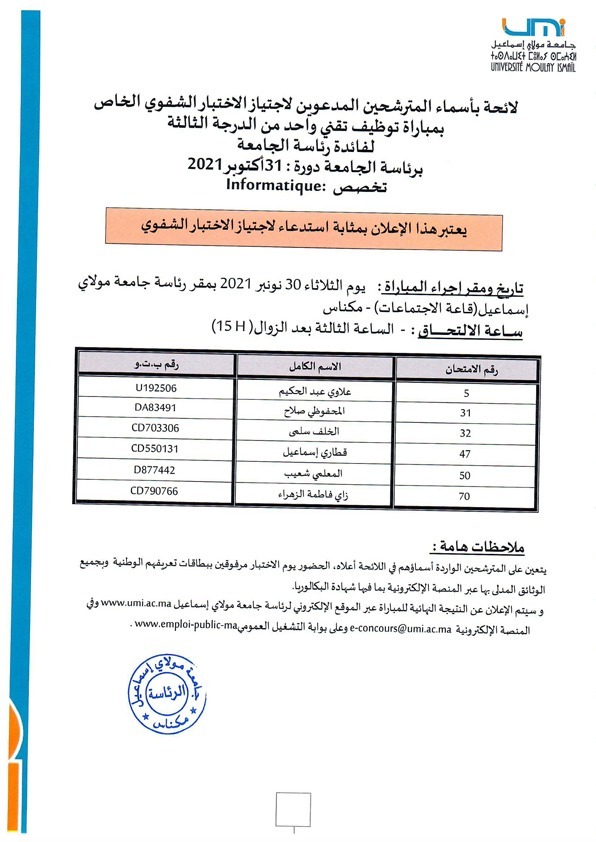 لائحة المترشحين المدعوين لاجتياز المرحلة الثانية الخاص لمباراة التوظيف في أستاذ محاضر الدرجة أ تخصص: Chimie des polymères11 décembre 2024