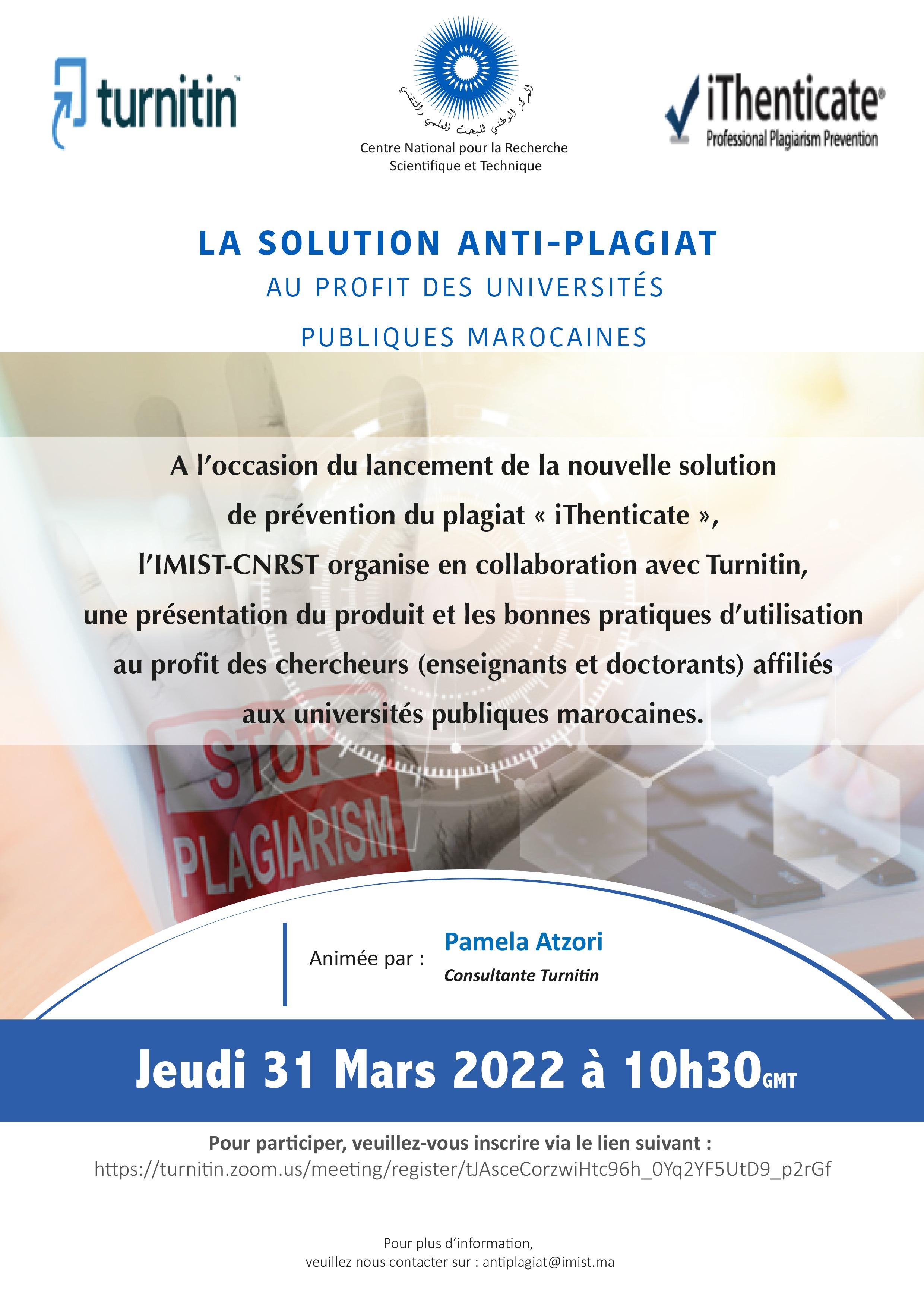 A l’occasion du lancement de la nouvelle solution de prévention du plagiat « iThenticate », l’IMIST-CNRST organise en collaboration avec Turnitin, une présentation du produit et les bonnes pratiques d’utilisation au profit des chercheurs (enseignants et doctorants) affiliés aux universités publiques marocaines et qui se tiendra en ligne, ce jeudi 31 mars à 10h30.