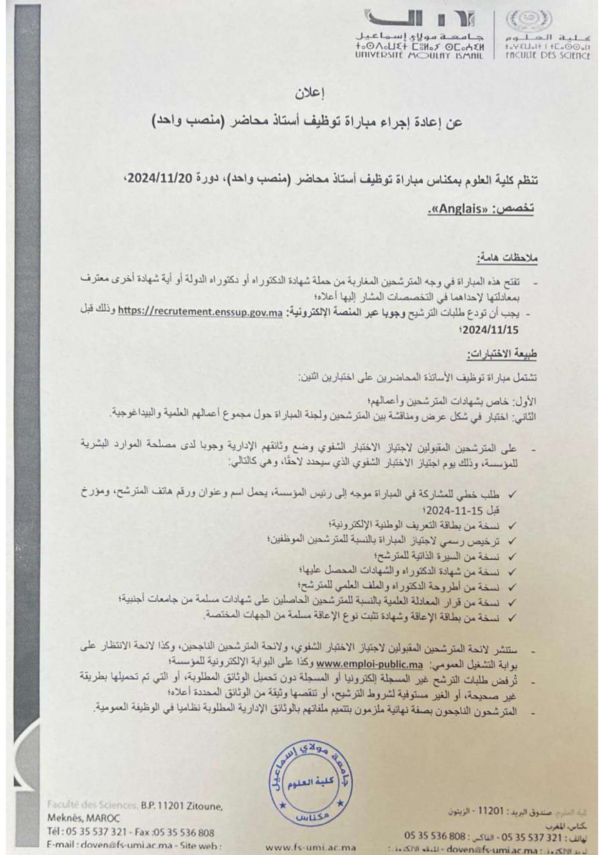 FS – إعلان عن مباراة لتوظيف أستاذ محاضر(إعادة فتح) – تخصص:الانجليزية