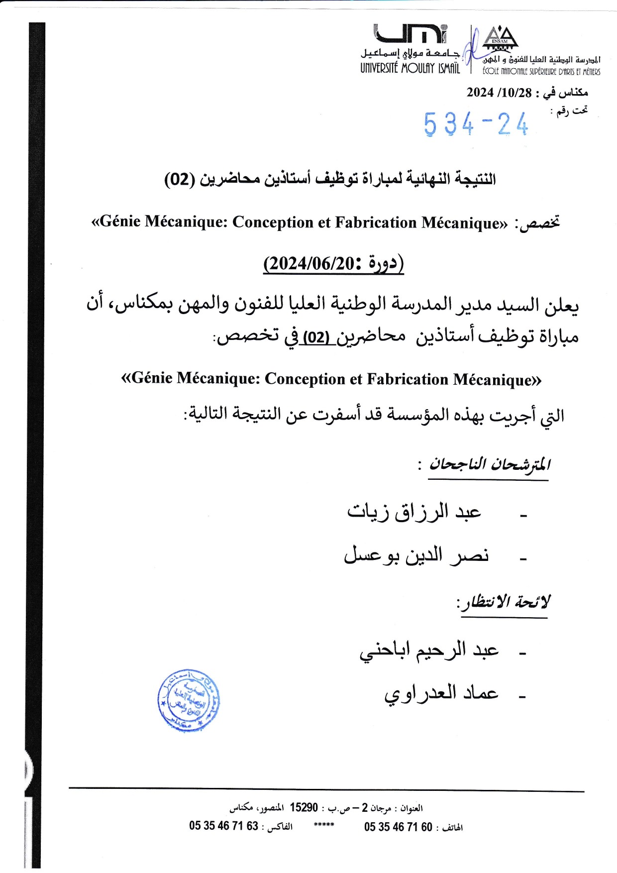 Génie mécanique conception et fabrication mécanique : النتيجة النهائية لمباراة توظيف أستاذ محاضر – تخصص Vous devriez également aimer Forum de l’Etudiant de Meknès8 février 2019 لفائدة حاملي شهادة البكالوريا عن فتح باب التسجيل القبلي بسلك الإجازة9 août 2024 Offre de Formation 2017-201825 septembre 2017