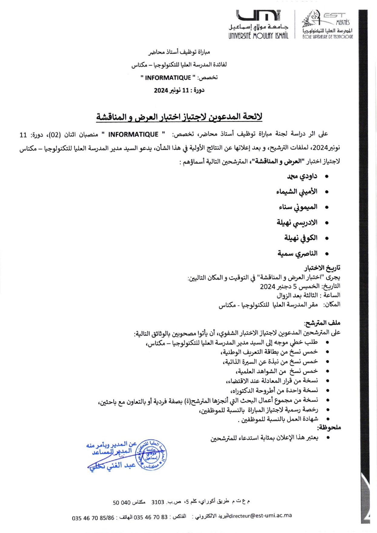 مباراة توظيف أستاذ محاضر لفائدة المدرسة العليا للتكنولوجيا – مكناس INFORMATIQUE : تخصص Vous devriez également aimer QATAR / Bourses de Recherche sur la Sécurité Alimentaire25 septembre 2020 Programmes des cours sur la Radio Régionale de Meknès et la Radio MEDINA FM du 26 Juin25 juin 2020 Programme Canadien de bourses de la Francophonie PCBF’20165 janvier 2016