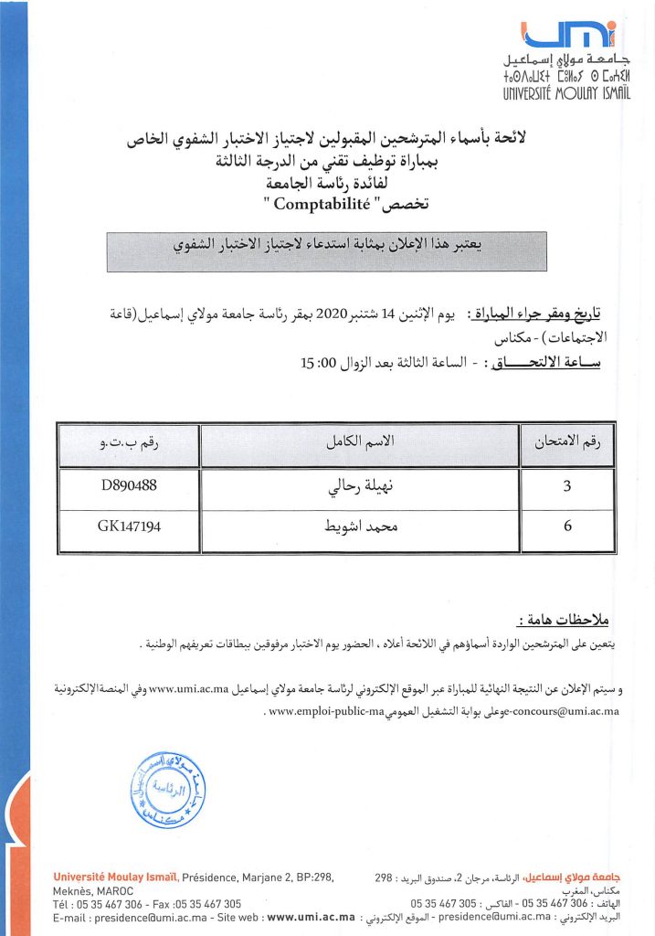 Vous devriez également aimer إعلان عن تنظيم مباريات توظيف أستاذين محاضرين24 octobre 2024 إعلان عن إجراء مباريات لتوظيف أطر إدارية وتقنية (23 منصبا)17 mai 2024 British Council lance un appel à propositions9 septembre 2013