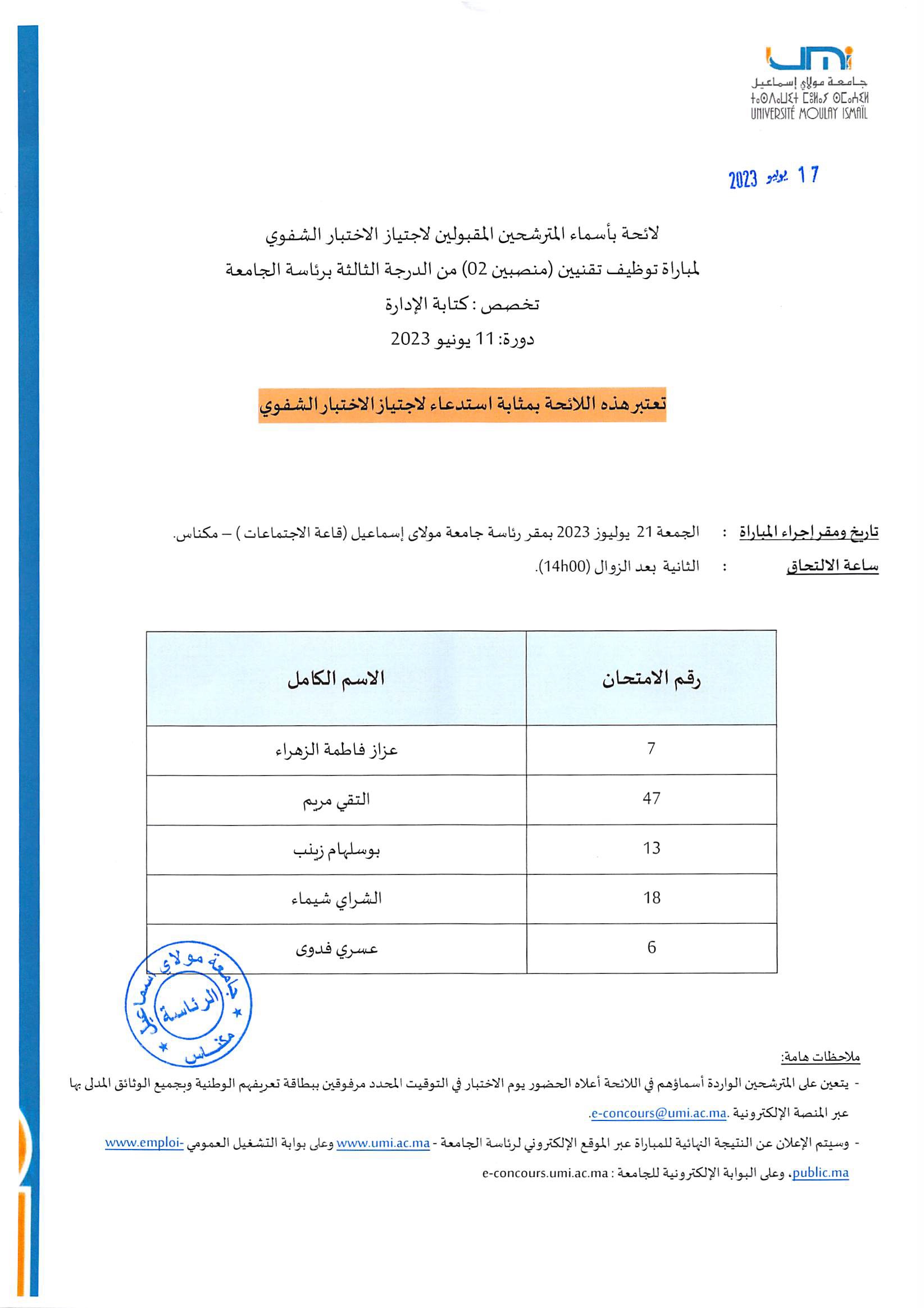 La liste des candidats convoqués pour passer l’entretien oral le Vendredi 21/07/2023 au sein de la présidence à 14H00 ( Session 11/06/2023 – Spécialité: Secrétariat de direction )