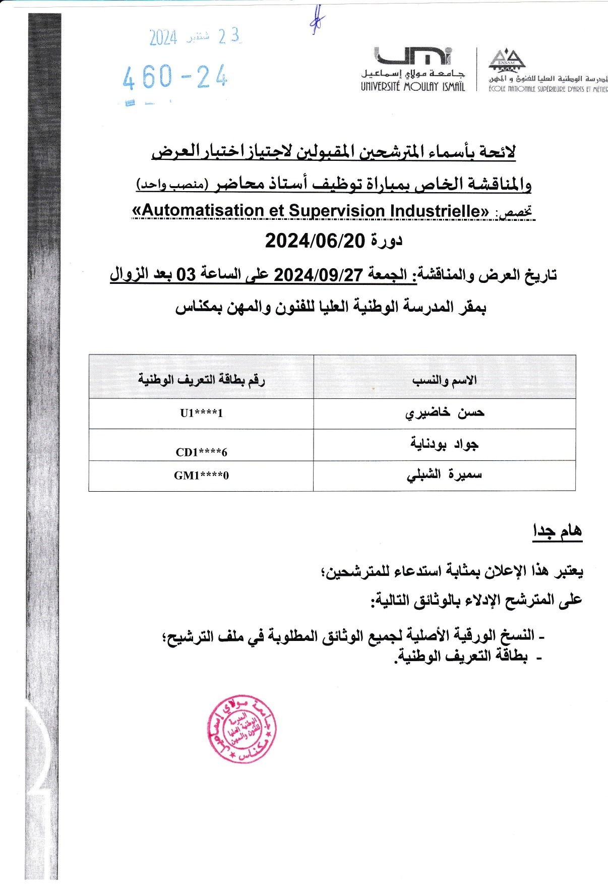 المترشحين المقبولين لاجتياز المقابلة الشفوية الخاصة بمباراة توظيف أستاذ محاضر تخصصي: الفلسفة العملية: الأخلاق السياسةوالفلسفة وتاريخ الفكر العلمي22 juillet 2024
