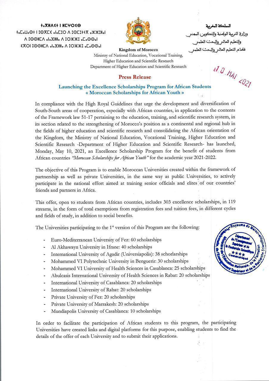 Conformément aux Hautes Orientations royales, appelant au développement et à la diversification des données de coopération Sud-Sud, notamment avec les pays africains, le ministère de l’Education Nationale, de la Formation Professionnelle, de l’Enseignement Supérieur et de la Recherche Scientifique lance ce lundi mai 2021 le programme de bourses d’excellence » Moroccan Scholarships For African Younth« , au titre de l’année universitaire 2021-2022.