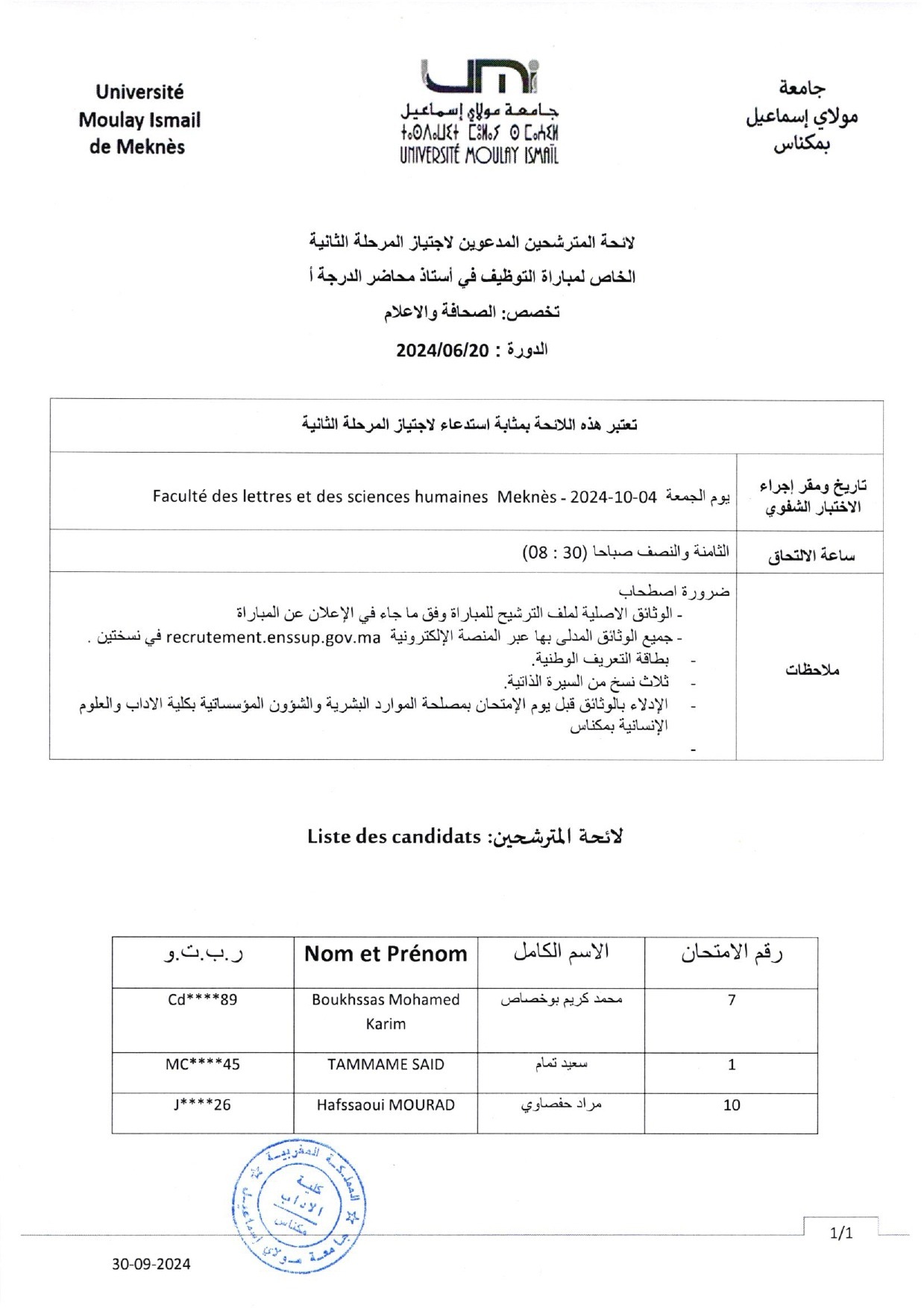 Résultat Final du Concours de Recrutement d’un Technicien de 3ème Grade – Spécialité: INFORMATIQUE/ au profit de la présidence de l’Université moulay Ismail.28 novembre 2022