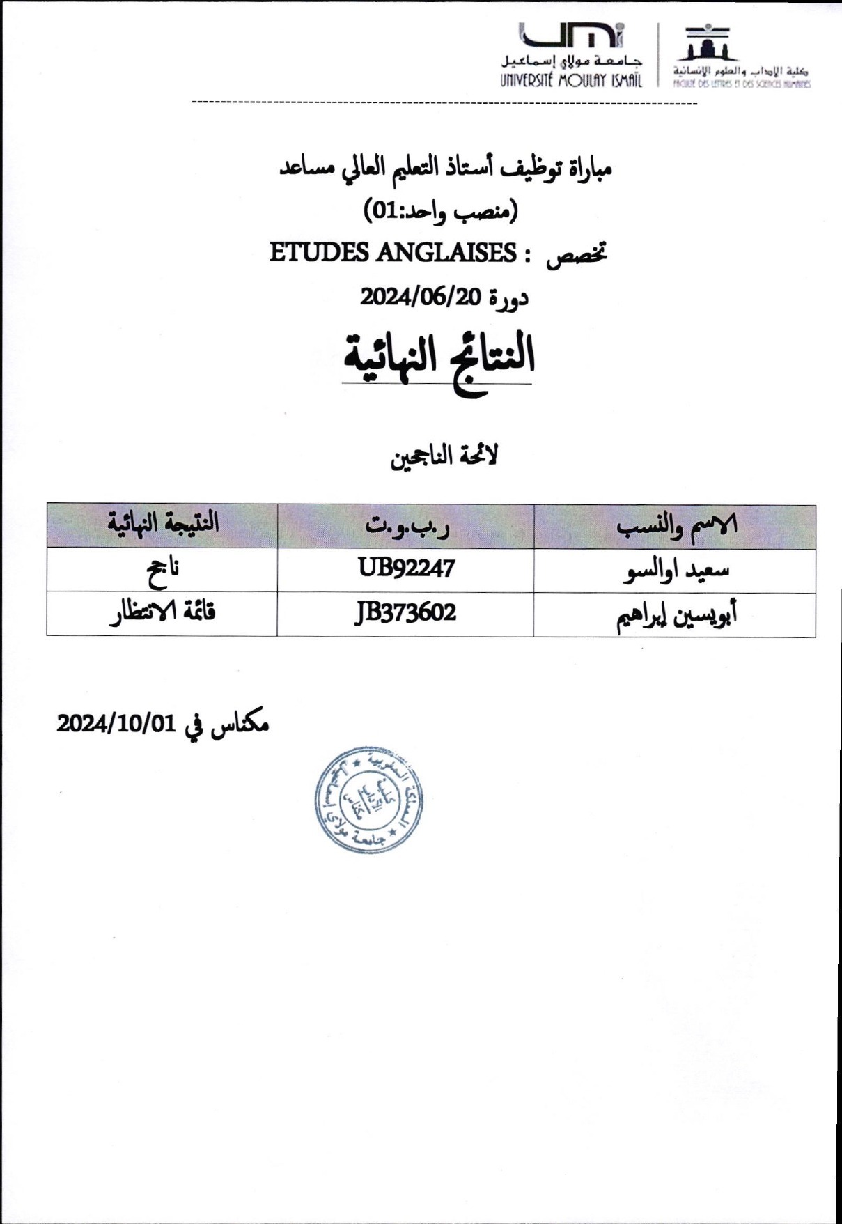 Le résultat final du concours de recrutement des MC spécialité: Etudes anglaises Vous devriez également aimer إعلان عن نتيجة مباراة توظيف أستاذ محاضر توظيف أستاذ محاضر في تخصص « GENIE LOGICIEL »6 septembre 2024 Formation sur la Gouvernance de la mer et la croissance bleue (Appel à candidature)10 juillet 2019 Programme de formation gratuite en ligne sur les politiques européennes15 juin 2016