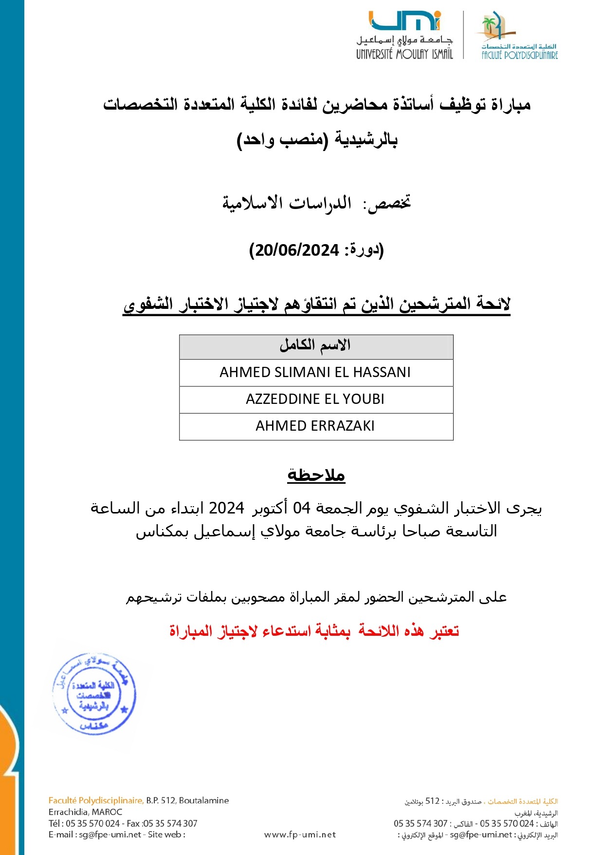 Les résultats de présélection des concours de recrutement des MC (Sessions : 20/06/2024) – spécialité: الدراسات الإسلامية Vous devriez également aimer Opportunités de bourse pour la Hongrie14 janvier 2016 Deux Enseignants de l’Université Moulay Ismail parmi les 15 premiers chercheurs au Maroc1 juin 2015 Revue de presse de l’UMI27 décembre 2017