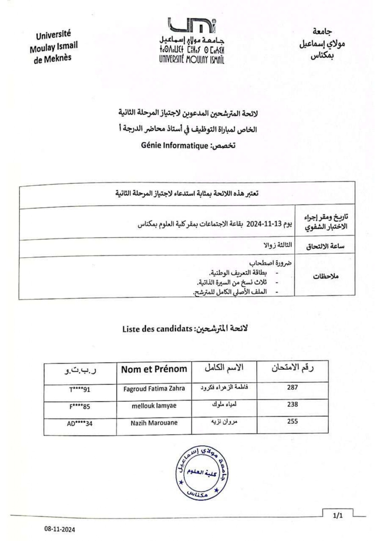 Liste des candidats convoqués à l’épreuve orale concours MC- Spécialité : Génie informatique Vous devriez également aimer النتيجة النهائية لمباراة توظيف أستاذ محاضر تخصص : تاريخ المغرب28 octobre 2024 Prix de la meilleure thèse – Prolongation du délai2 novembre 2022 Nouvelle publication: « Femmes Artistes de Meknès Tafilalet »28 avril 2014