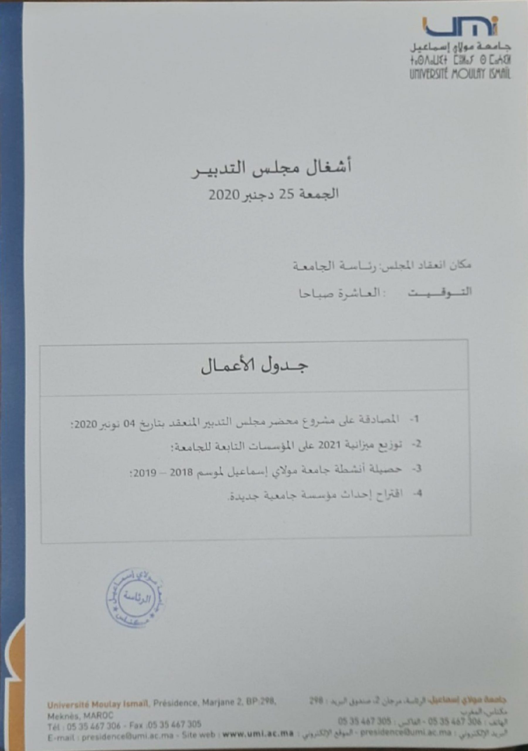 – Secrétariat de Direction (FMP Errachidia)- -Gestion des entreprises (Présidence)- Vous devriez également aimer إعـلان : مباراة توظيف تقني من الدرجة الثالثة – كتابة الإدارة27 octobre 2022 Appels à projets Erasmus+9 novembre 2016 Contribution de l’UMI à l’élaboration de la charte éthique des sciences et technologies8 janvier 2020