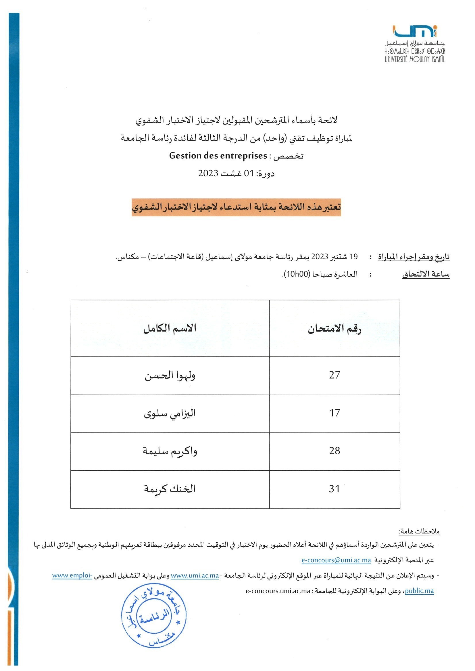 Résultat Final du Concours de Recrutement d’un Technicien 3ème grade – Spécialité : Gestion des entreprises – Session: 01/08/202313 octobre 2023