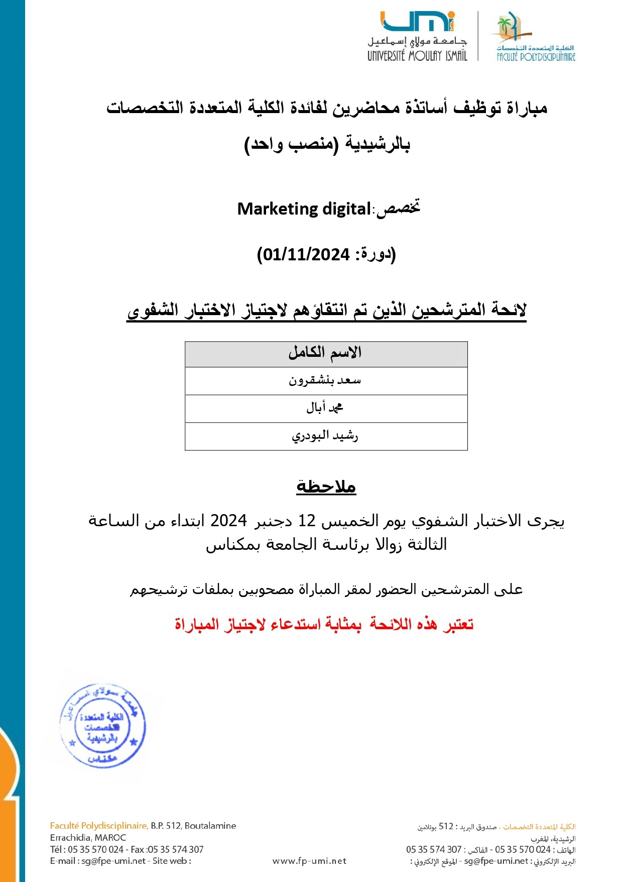 مباراة توظيف أساتذة محاضرين لفائدة الكلية المتعددة التخصصات بالرشيدية (منصب واحد) Marketing digital : تخصص Vous devriez également aimer Appel aux étudiantes et étudiants de l’Université Moulay Ismail28 février 2022 📢 Appel à candidatures : Physics League Across Numerous Countries for Kick-Ass Students (PLANCKS)12 février 2024 إعلان عن إعادة فتح باب الترشيح لشغل مناصب رؤساء مصالح بكلية العلوم بمكناس27 février 2025