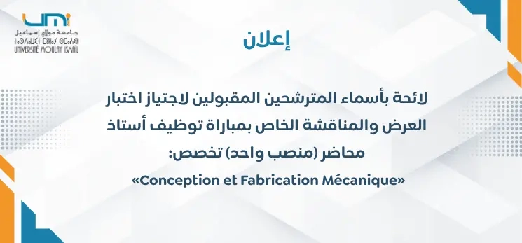لائحة بأسماء المترشحين المقبولين لاجتياز اختباري العرض والمناقشة في مباراة توظيف أستاذ محاضر (منصب واحد: 01) في تخصص «Conception et Fabrication Mécanique».