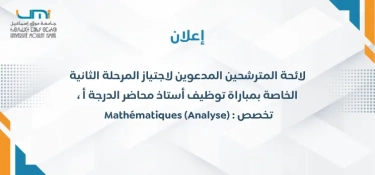 لائحة المترشحين المدعوين لاجتياز المرحلة الثانية الخاصة بمباراة توظيف أستاذ محاضر الدرجة أ ، تخصص : (Mathématiques Analyse)