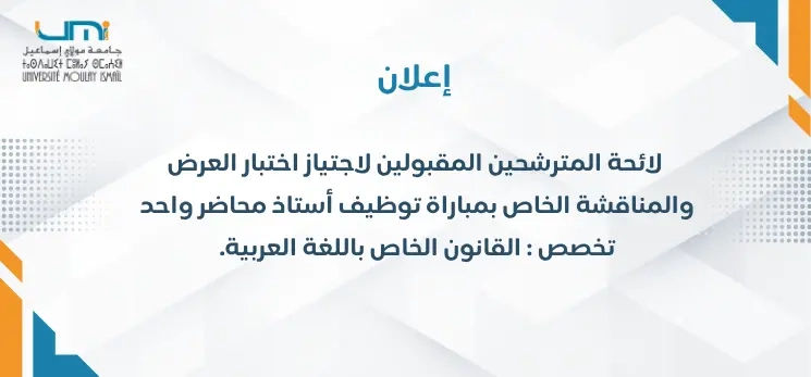 لائحة بأسماء المترشحين المقبولين لاجتياز اختبار العرض والمناقشة الخاص بمباراة توظيف أستاذ محاضر واحد في تخصص القانون الخاص باللغة العربية