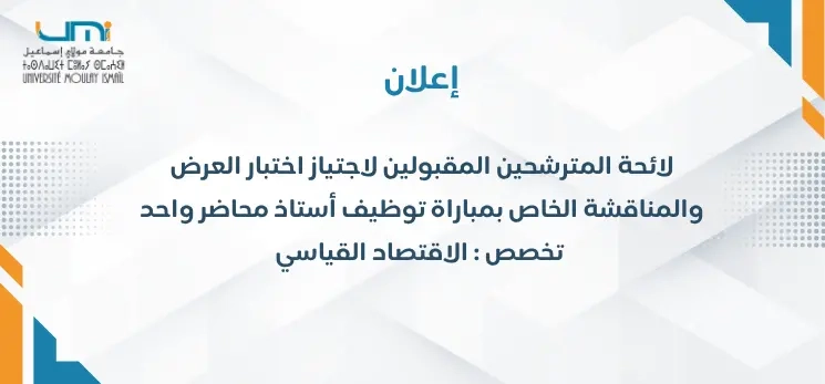 لائحة بأسماء المترشحين المقبولين لاجتياز اختبار العرض والمناقشة الخاص بمباراة توظيف أستاذ محاضر واحد في تخصص الاقتصاد القياسي