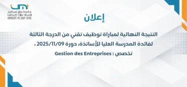 النتيجة النهائية لمباراة توظيف تقني من الدرجة الثالثة لفائدة المدرسة العليا Gestion des Entreprises : للأساتذة، دورة 2025/11/09 ، تخصص