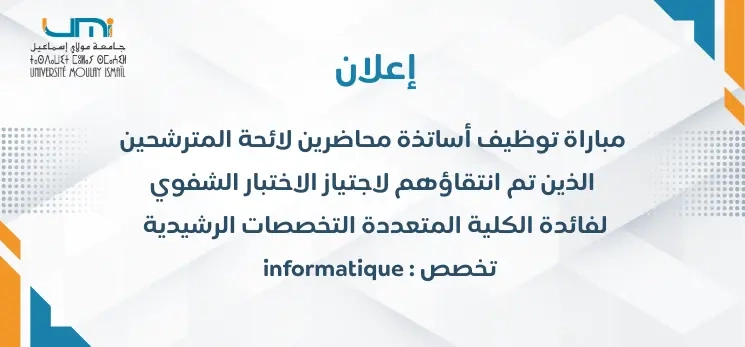 مباراة توظيف أساتذة محاضرين لائحة المترشحين الذين تم انتقاؤهم لاجتياز الاختبار الشفوي لفائدة الكلية المتعددة التخصصات الرشيدية تخصص informatique