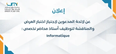 الإعلان عن لائحة المدعوين لاجتياز اختبار العرض والمناقشة لتوظيف أستاذ محاضر تخصص