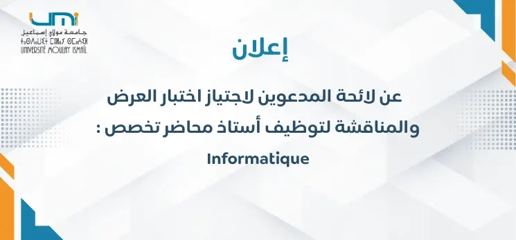 الإعلان عن لائحة المدعوين لاجتياز اختبار العرض والمناقشة لتوظيف أستاذ Informatique : محاضر تخصص