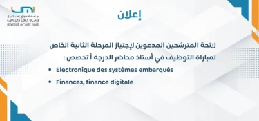 لائحة المترشحين المدعوين لإجتياز المرحلة الثانية الخاص لمباراة التوظيف في أستاذ محاضر (Electronique des systèmes embarqués) (Finances, finance digitale) الدرجة أ تخصص