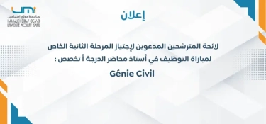 لائحة المترشحين المدعوين لإجتياز المرحلة الثانية الخاص لمباراة التوظيف في أستاذ محاضر Génie Civil : الدرجة أ تخصص