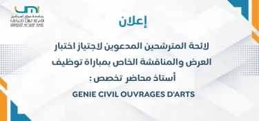 لائحة المترشحين المدعوين لاجتياز اختبار العرض والمناقشة الخاص بمباراة توظيف أستاذ GENIE CIVIL OUVRAGES D'ARTS : محاضر تخصص
