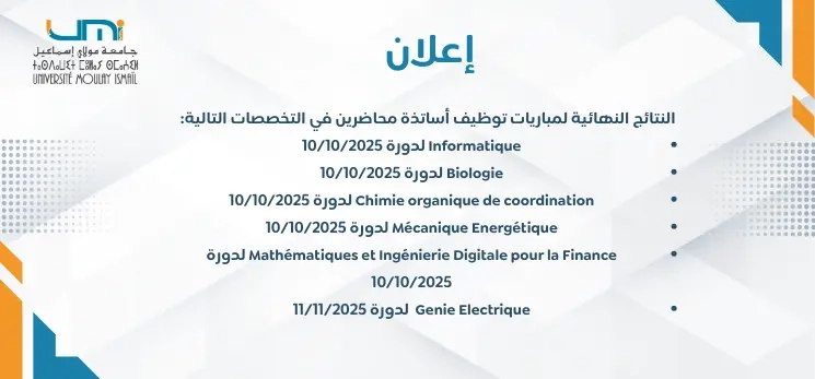 النتائج النهائية لمباريات توظيف أساتذة محاضرين في التخصصات التالية Informatique/ Biologie/Chimie organique de coordination/Mécanique Energétique/Mathématiques et Ingénierie Digitale pour la Finance/Genie Electrique