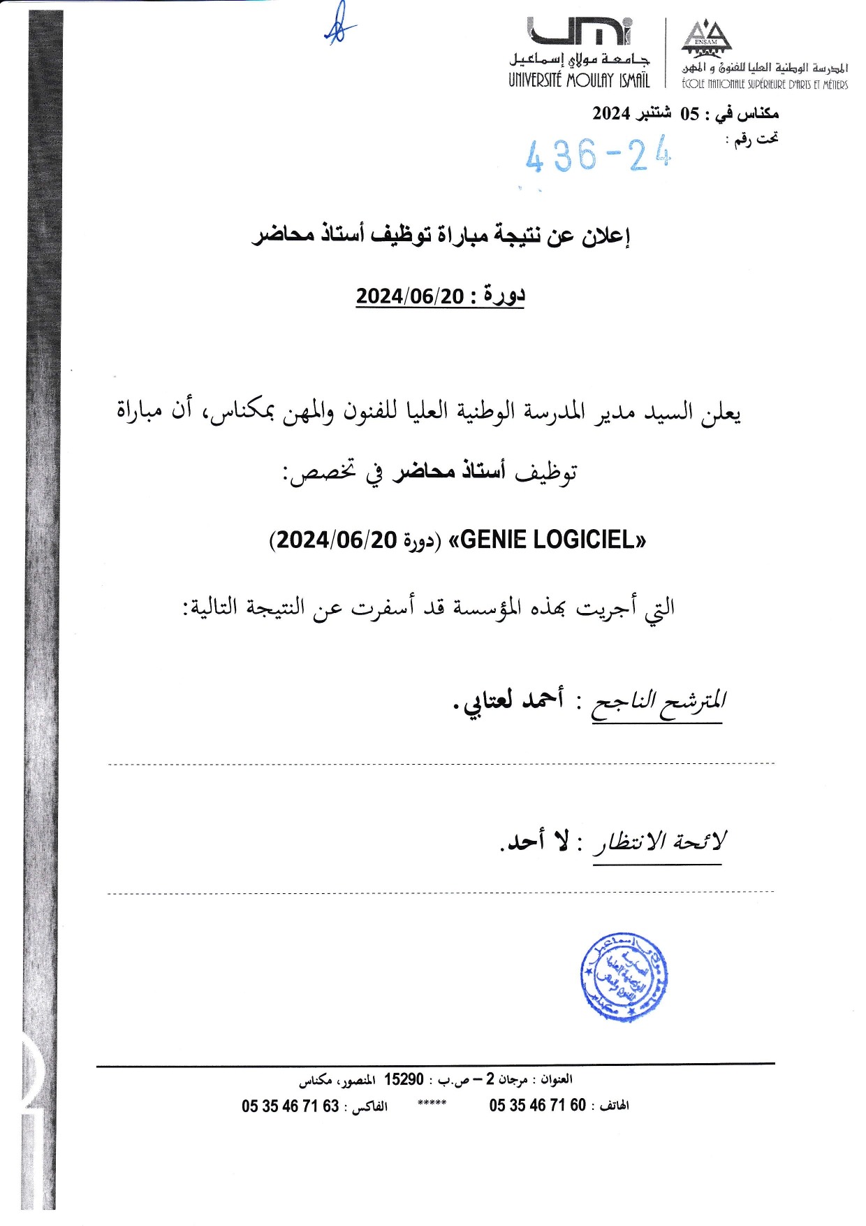 إعلان عن نتيجة مباراة توظيف أستاذ محاضر توظيف أستاذ محاضر في تخصص « GENIE LOGICIEL » Vous devriez également aimer Aid Moubarak Said2 octobre 2014 معلومات ونصائح حول مرض ڤيروس كورونا المستجد6 mars 2020 Erasmus+ : Sessions d’informations 201914 juin 2019