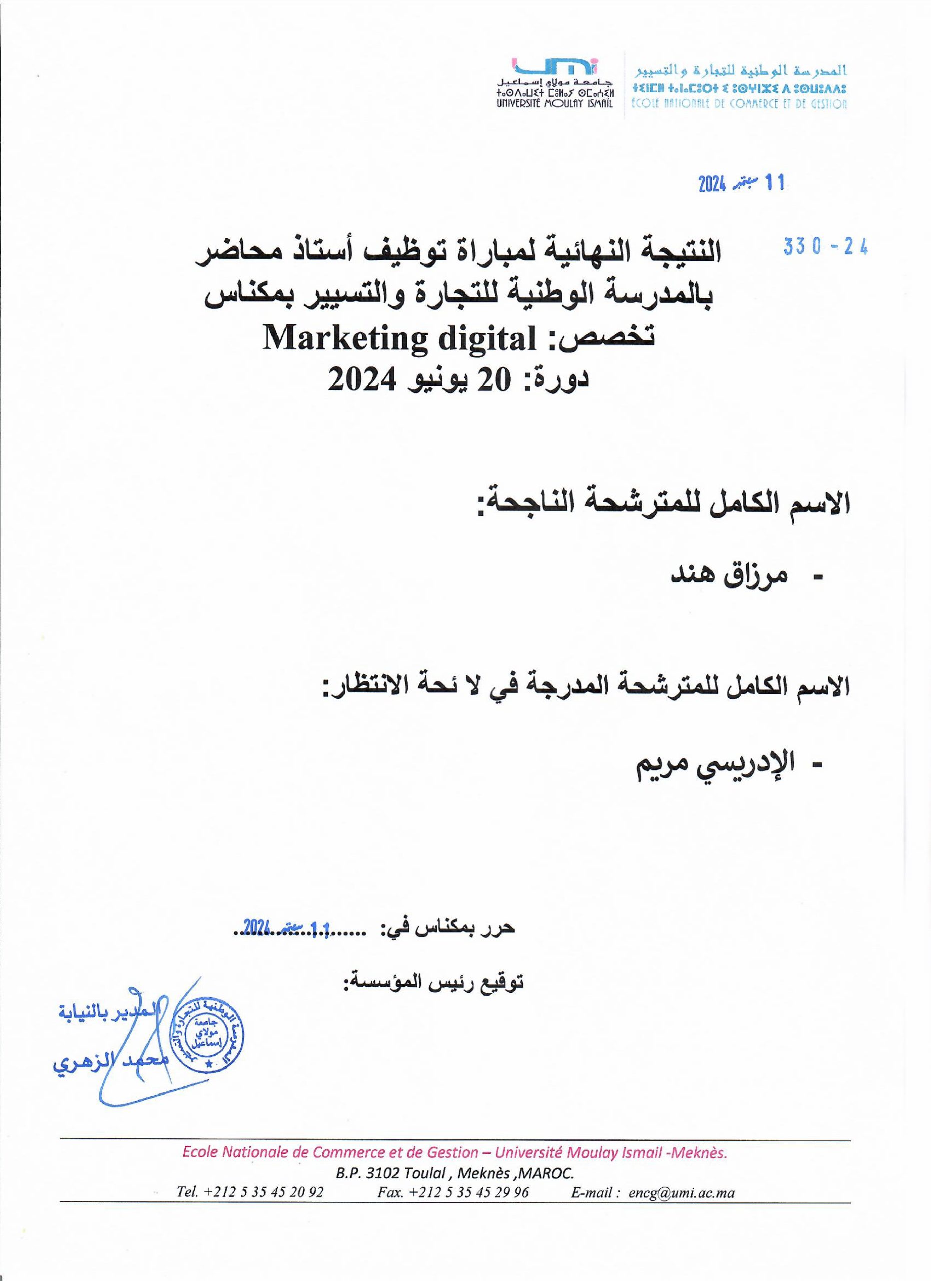 Résultats finaux pour le concours de 5 MC (Économie, Économétrie, Fiscalité d’entreprise, Marketing digital, Finance-comptabilité) de la session du 20 juin 2024.