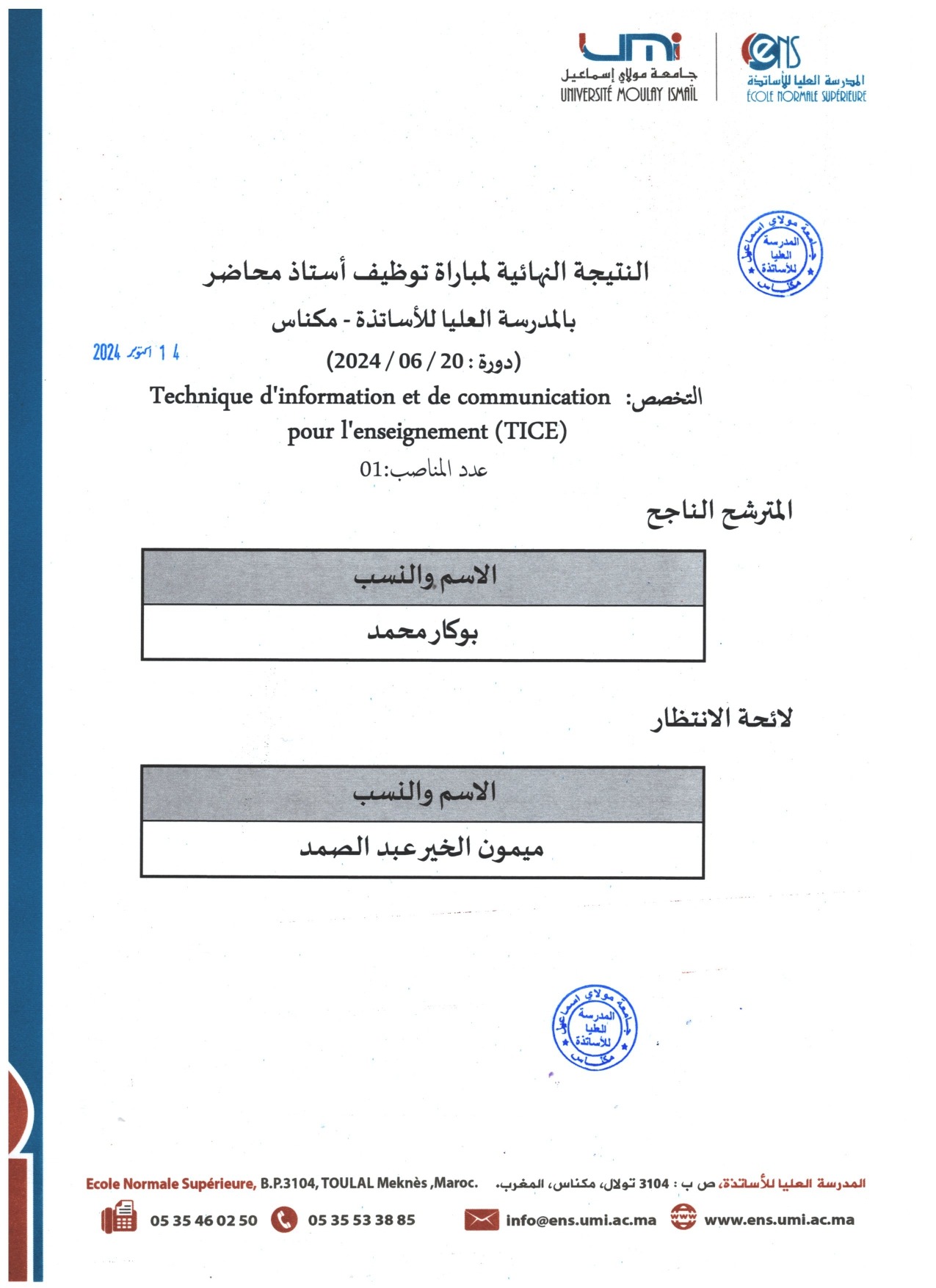 (TICE) : النتيجة النهائية لمباراة توظيف أستاذ محاضر تخصص Vous devriez également aimer لـقاء علمي “الوساطة بجامعة مولاي إسماعيل: آلية مؤسساتية لتقوية ثقافة وحكامة التدبير”14 avril 2021 Annonce: accréditation et renouvellement d’accréditation22 octobre 2012 ملخص اجتماع مجلس الجامعة المنعقد يــوم الأربعاء 04 نونبر 20209 novembre 2020