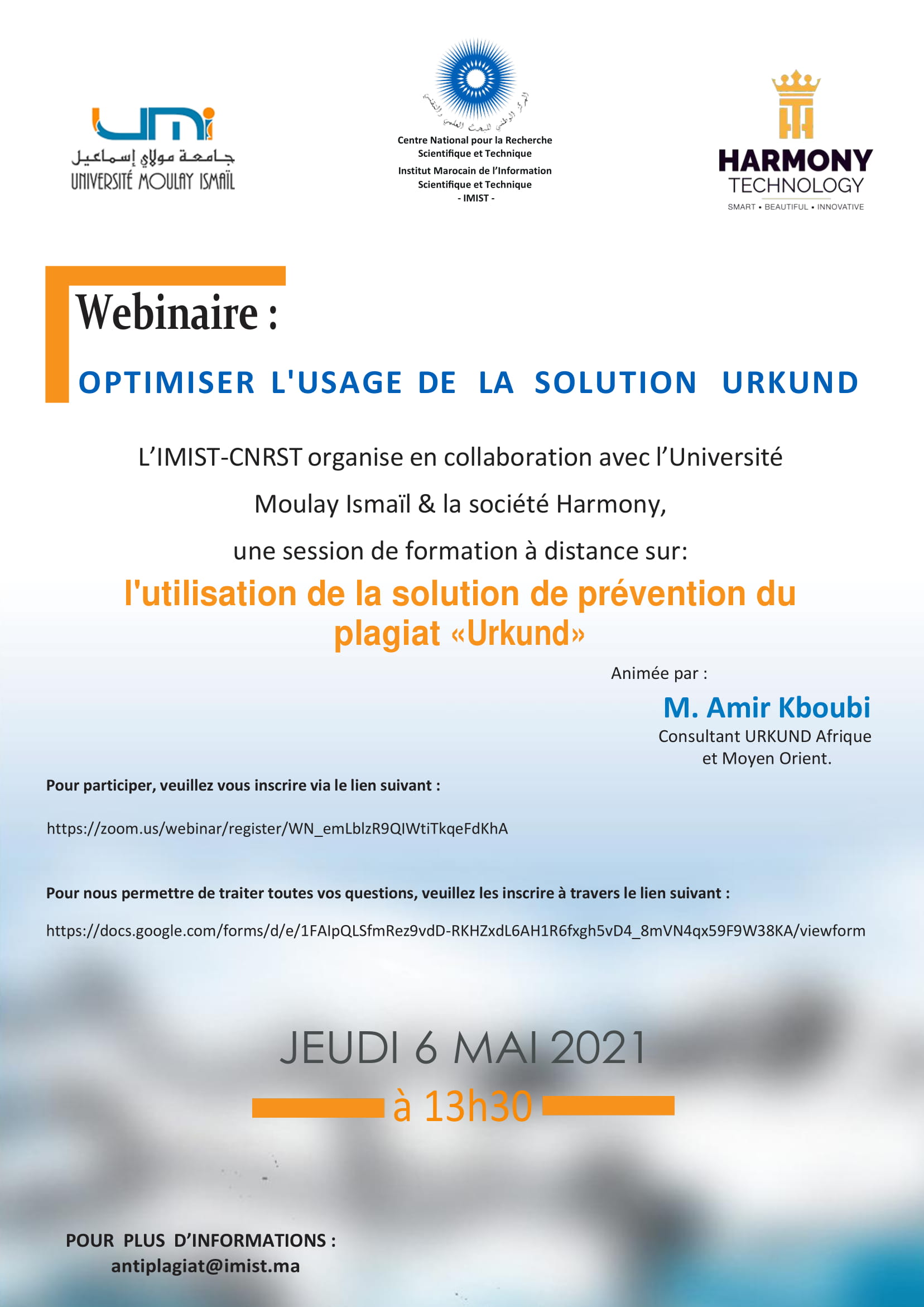L’IMIST-CNRST organise en collaboration avec l’Université Moulay Ismaïl & la société Harmony, une session de formation à distance sur: l’utilisation de la solution de prévention du plagiat «Urkund»